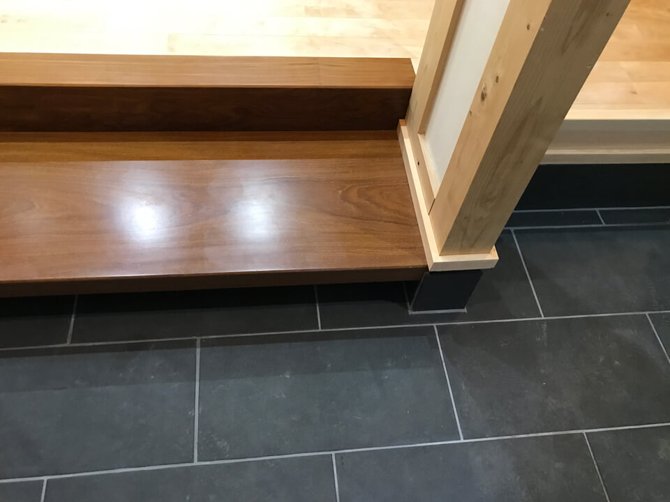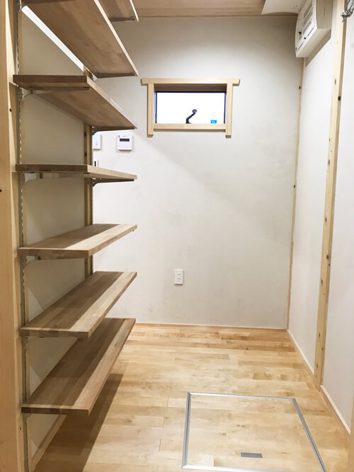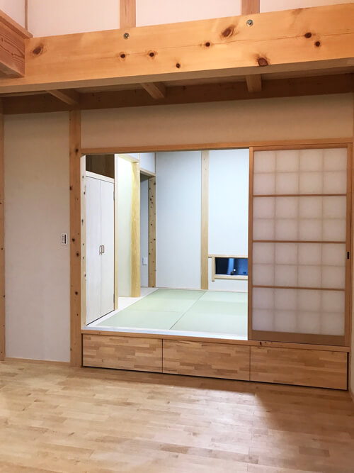 和風の上がり框と、収納スぺ-スへの入口が並んだ設計
