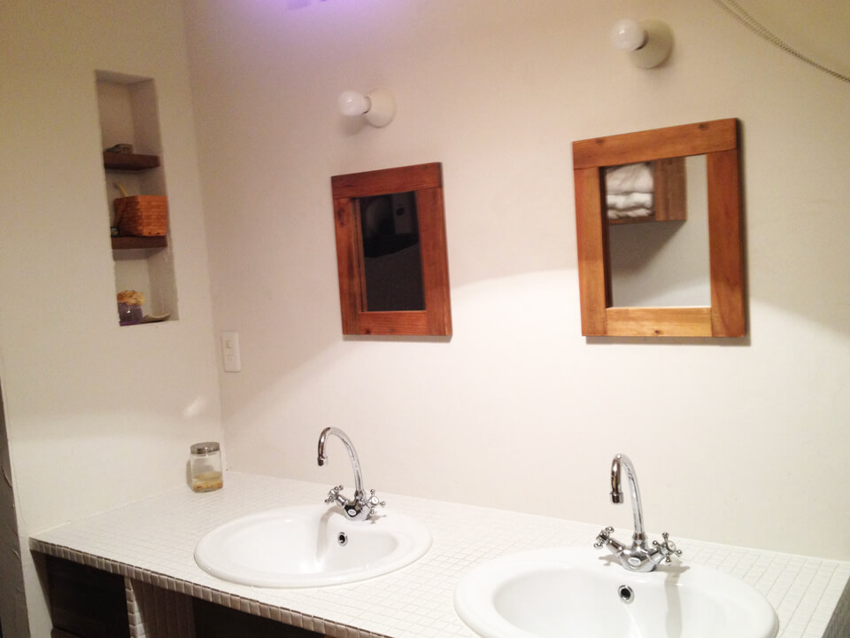 白いタイルが張られた、2人並べるオリジナル洗面化粧台