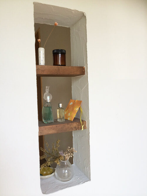 K様が塗られた漆喰と天然木の棚に飾られた小物達