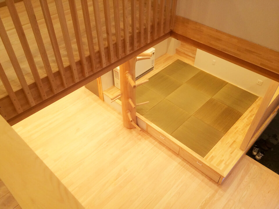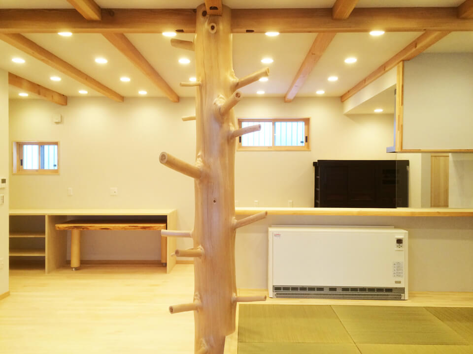 リビングにはどっしりと枝付大黒柱お子様たちの遊び場に