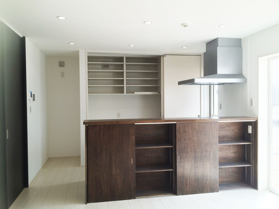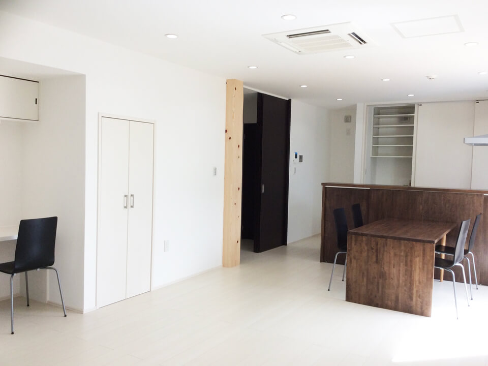 白とこげ茶の開放的なリビング。中央大黒柱は自然のままの色