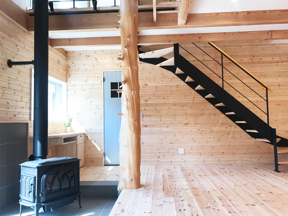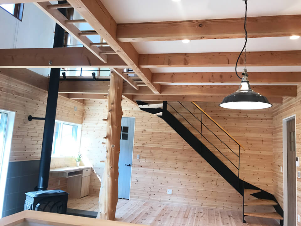 枝付大黒柱は天井までパインの壁が温かみを演出