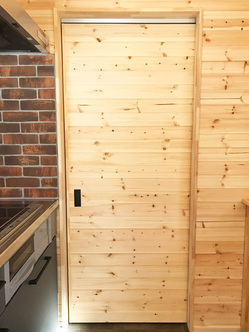 壁と合わせたパイン材を横貼りして製作したパントリ-の吊り引戸